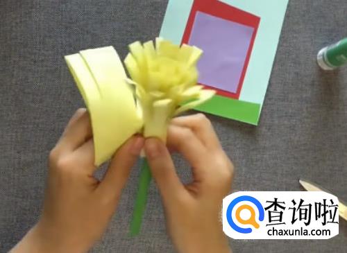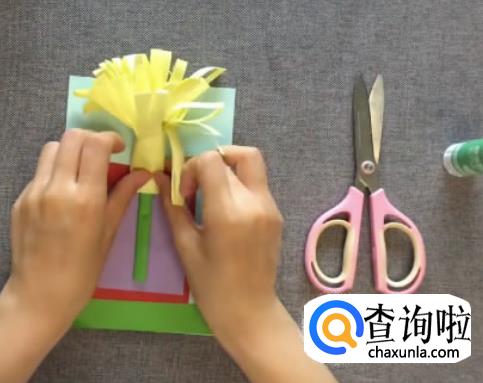 取绿色卡纸反复折叠成细条,用胶水粘好,作为花杆,备用。将花杆卷入已经剪好的彩纸,作为花朵造型。