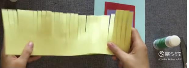 重新取一张鲜艳颜色的卡纸,对折,在一侧剪出若干细条,注意不要剪断,备用。
