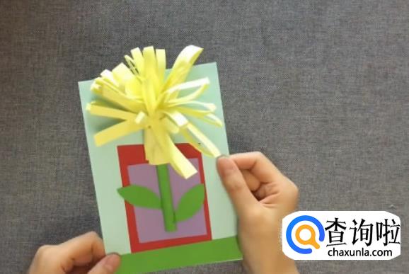 用红色的卡纸剪出一个花盆造型,再将花盆造型粘在另一张长方形的卡纸上。