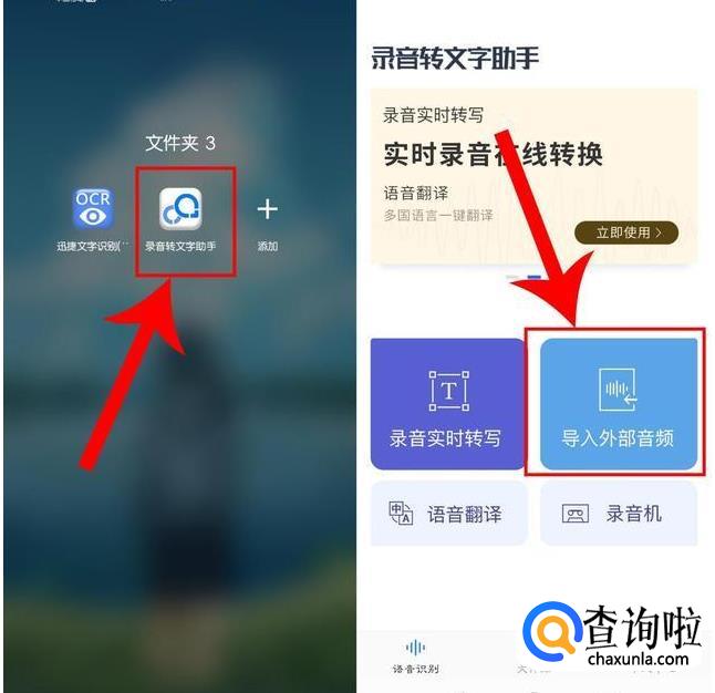 首先在应用市场找到录音转文字助手并将其装好在手机桌面上,然后打开工具点击导入外部音频功能。