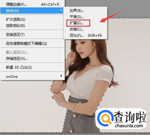 得到背景的选区之后在选择菜单那里找到修改选项,点击修改选项在其内找到扩展选项,如图所示: