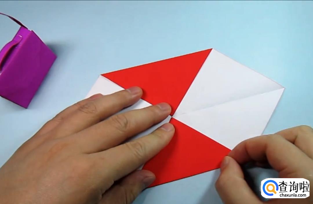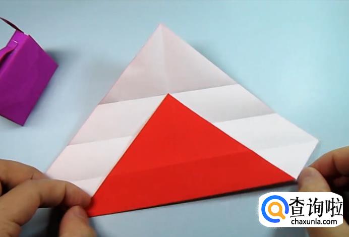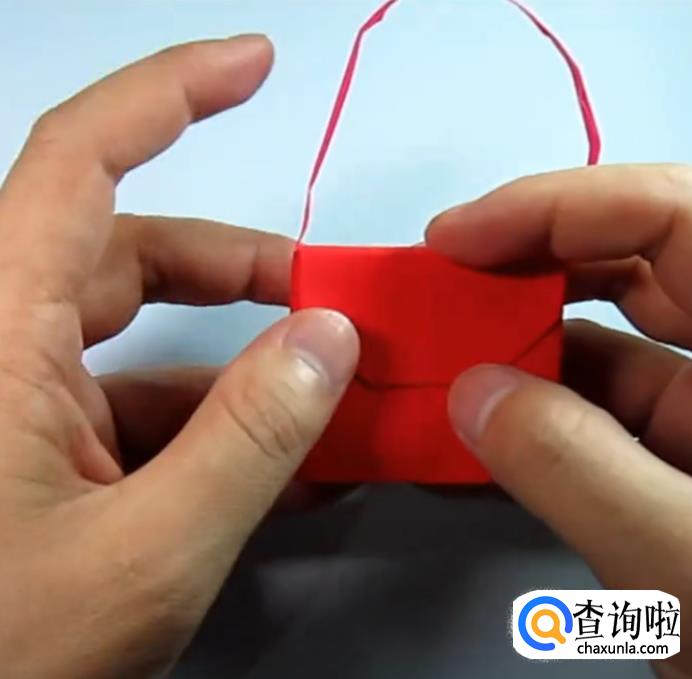 分别粘在两侧,调整好位置,将翘起来的部分也粘上胶水,这样一个漂亮的手提包就做好了,可以尝试不同颜色的纸,折贴出五颜六色的手提包放在一起是不是很漂亮呢。