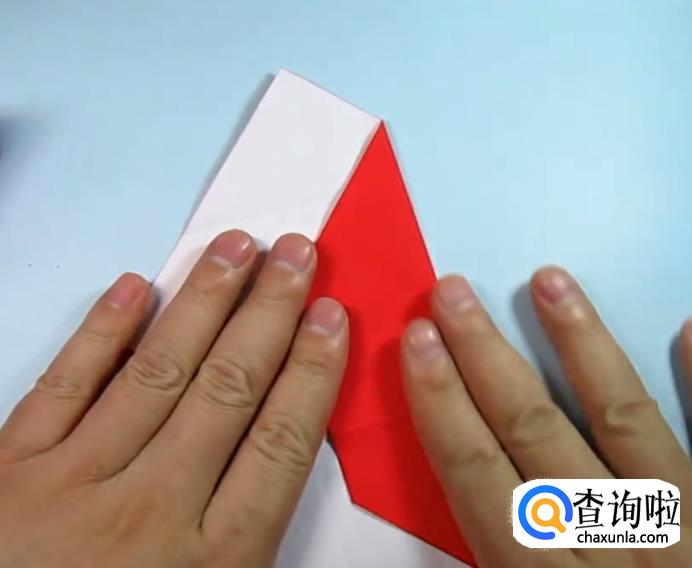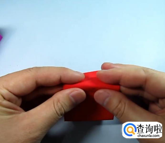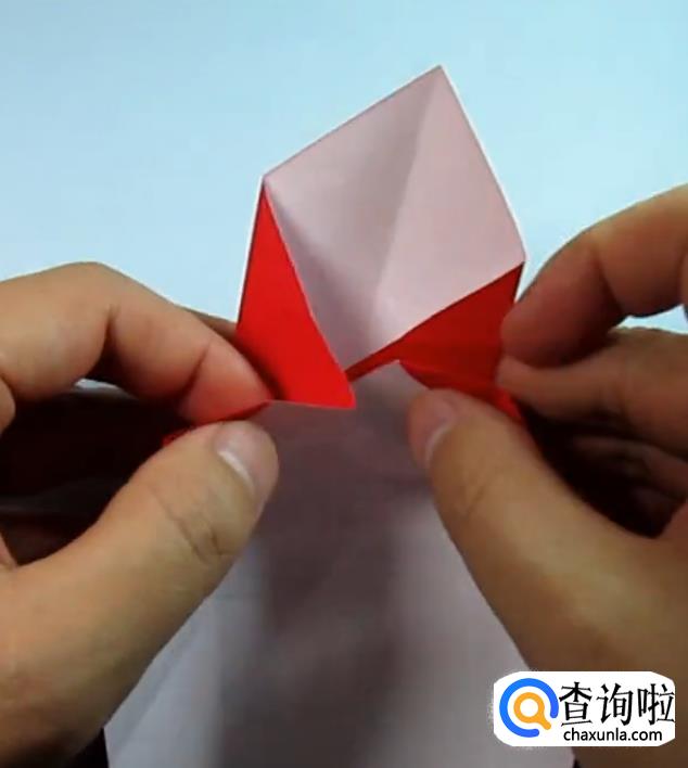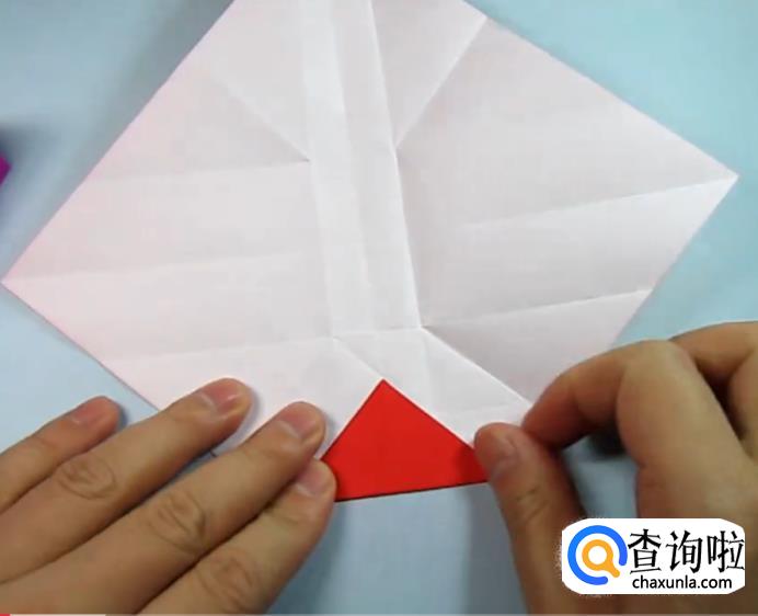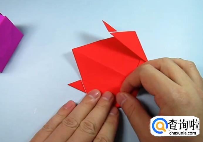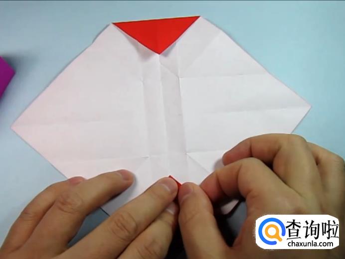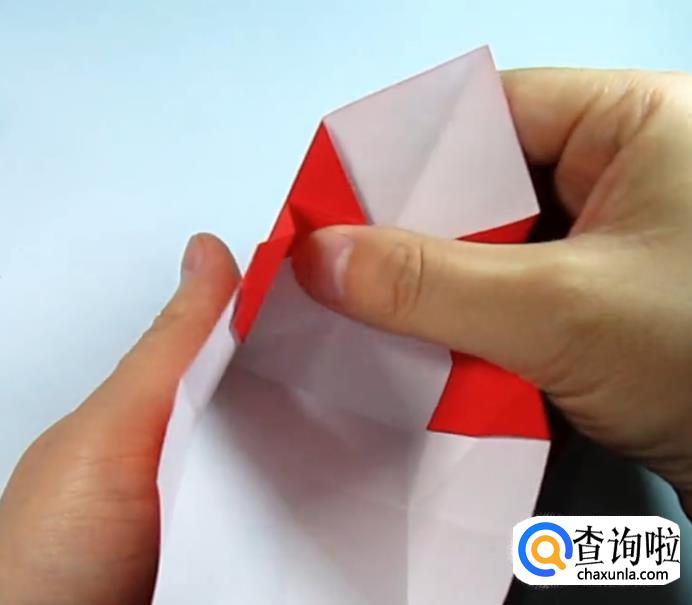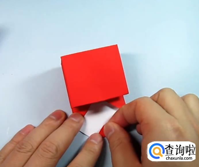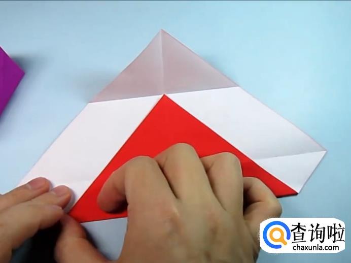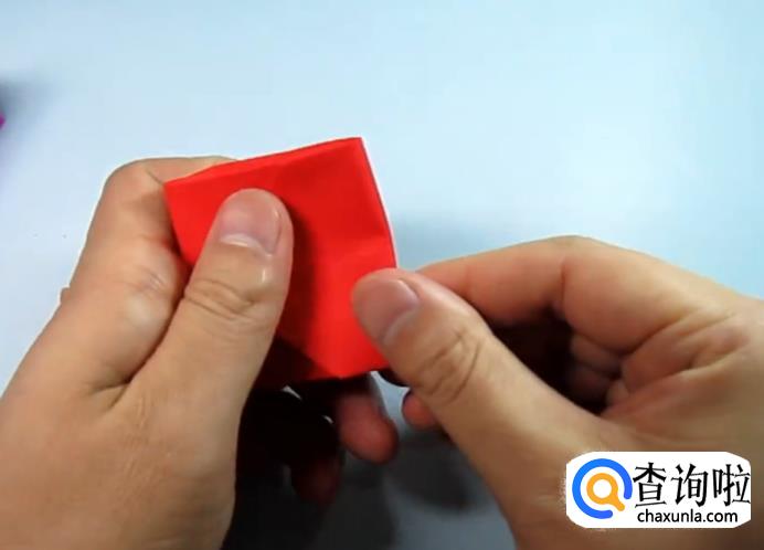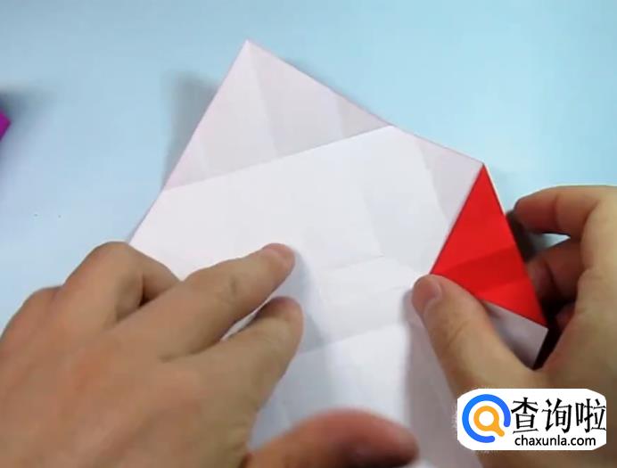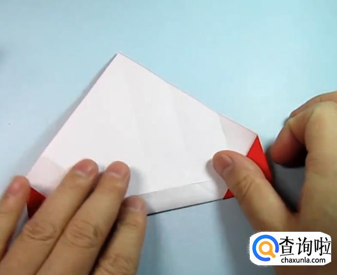 把一侧的正方形往下压,在把上面的角往下折,盖住即可,在把角展开,展开的角往里折一点点。