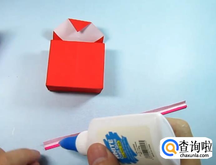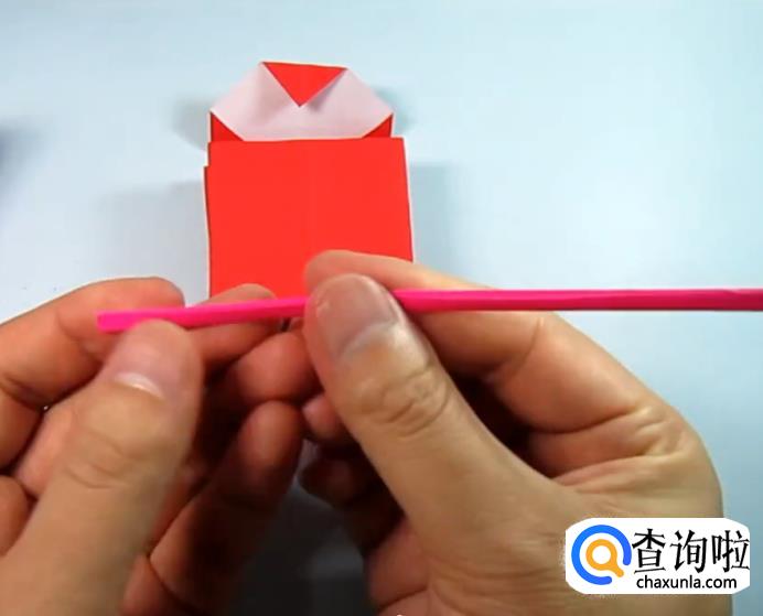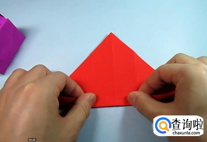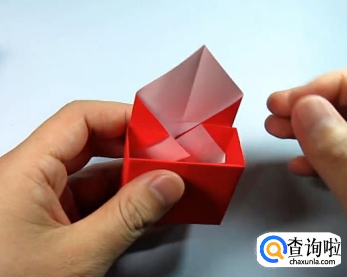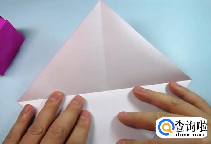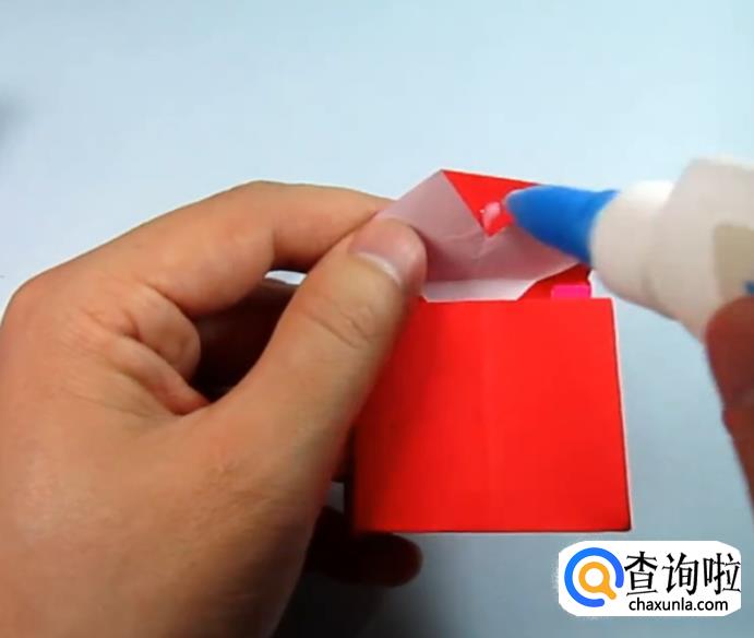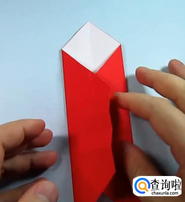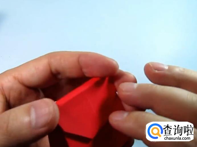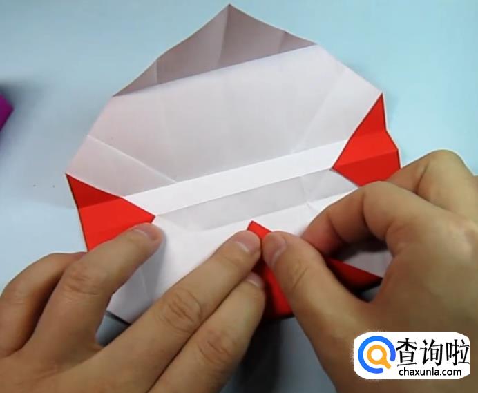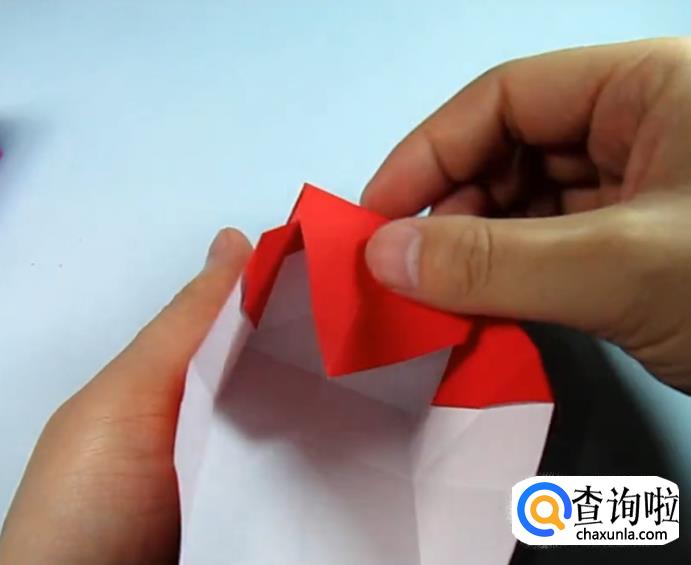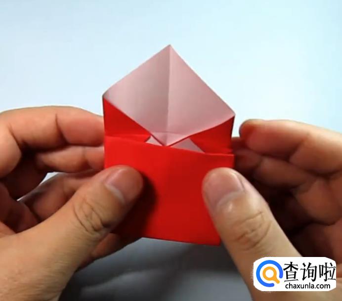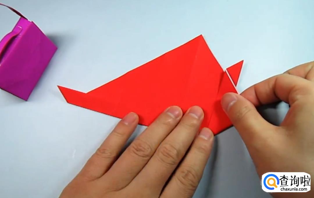 把一侧的正方形往下压,在把上面的角往下折,盖住即可,在把角展开,展开的角往里折一点点。