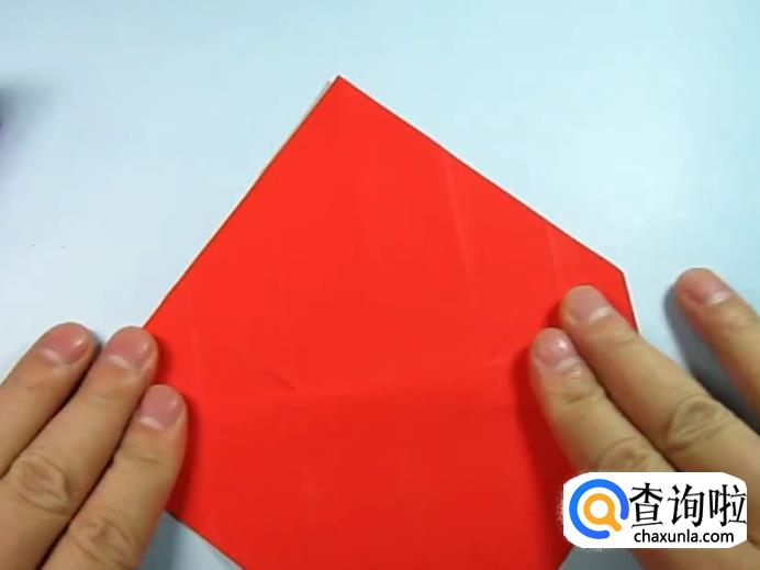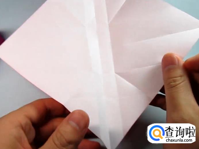 展开,将下面的角向上折和上面第一次留下的折痕对齐,展开,上面的角也按照相同的方式对折展开。