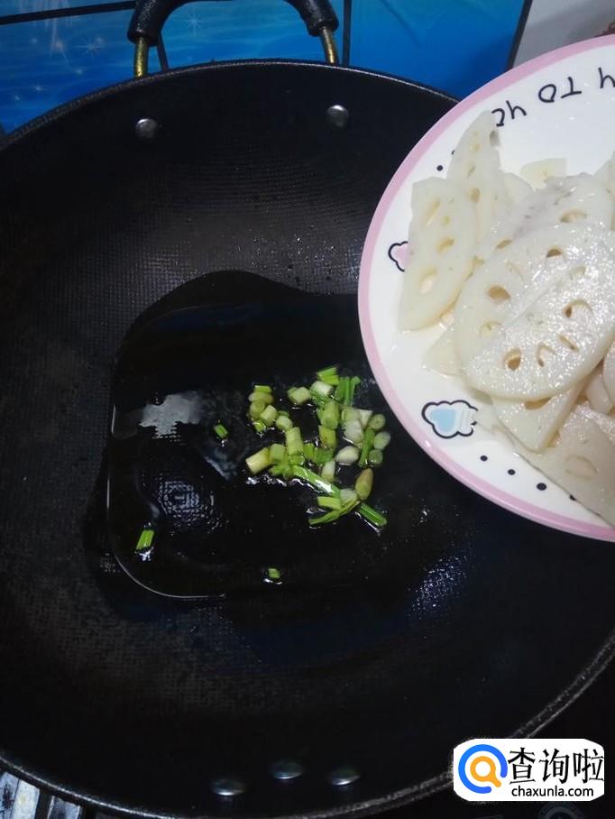 炒锅中放入适量油,油热后,将蒜苗碎放入锅中炒香,然后将莲藕倒入锅中,翻炒均匀。