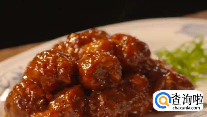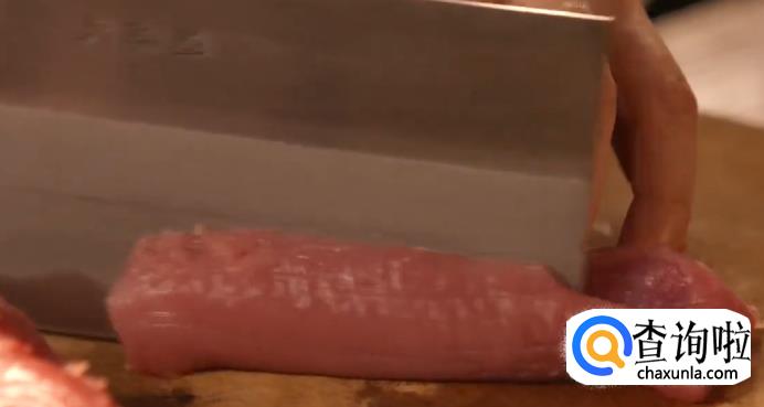 接着挑出腌好的肉块,划刀的一面朝外,沿三个角向内翻折,用虎口捏成荔枝的球状。