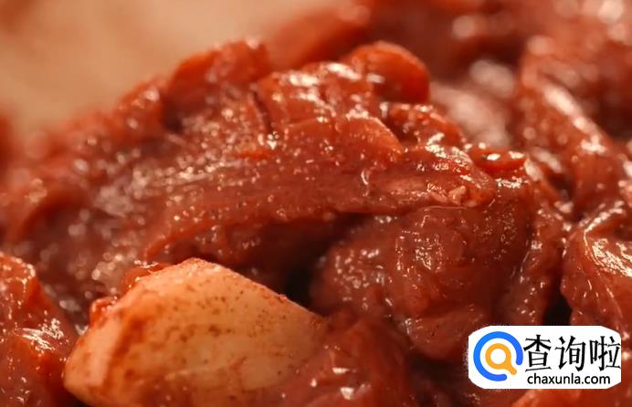 之后加盐、料酒、湿淀粉、红曲粉抓匀,加入去皮切小块的马蹄,腌制10分钟。