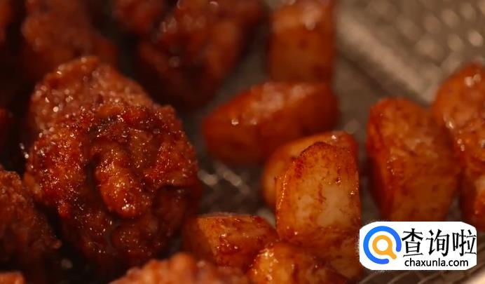 等油锅热到八成,把肉逐一放到锅中,炸到酥脆时捞出,再放入马蹄稍炸,捞出沥油。