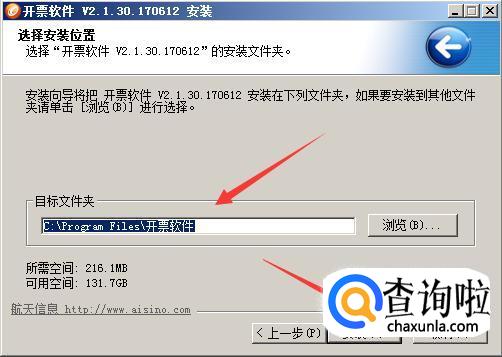 地区编号确定之后,系统会弹出选择安装路径的提示,选择需要安装的路径(默认路径为:C:Program Files开票软件),然后点“安装”。