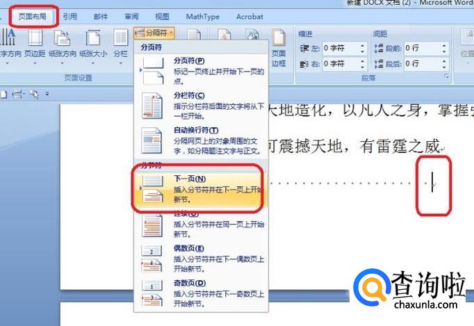 光标移到第二页的页末,如图所示,点击“页面布局”,插入“下一页分隔符”。