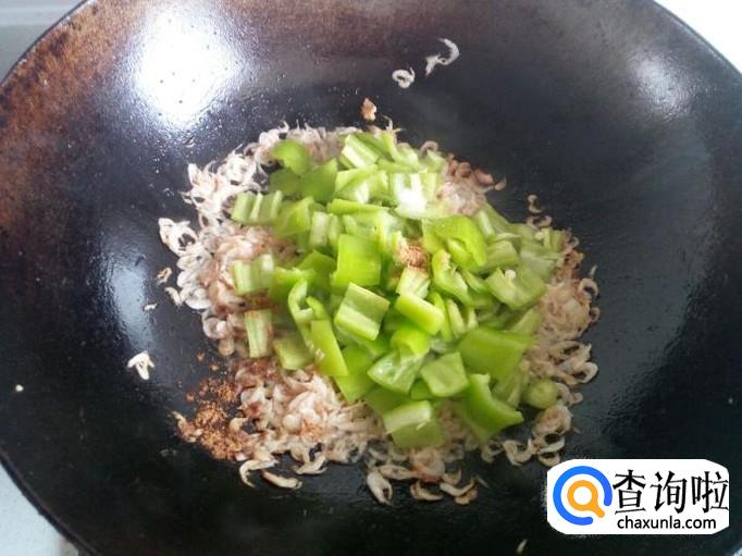 放入青尖椒,转大火快速翻炒,放入五香粉,少许盐(虾皮有脱盐和没脱盐两种,如果没脱盐的虾皮,可以不放盐)。