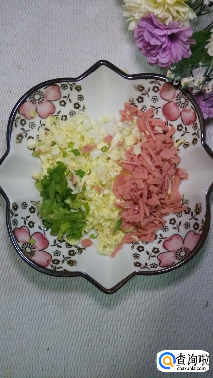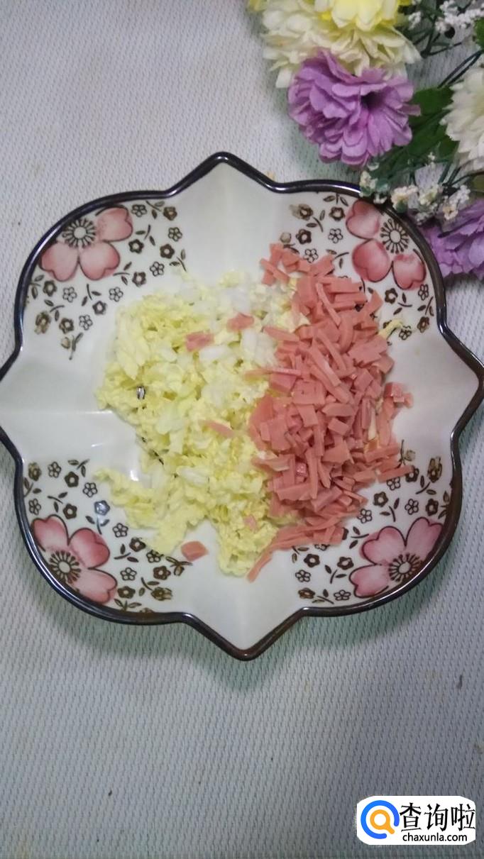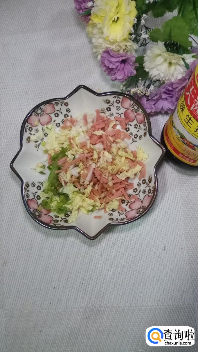 将白菜叶和火腿肠都切碎后,放入盘中,再将大蒜和小葱也切碎,和白菜,香肠放在一起。