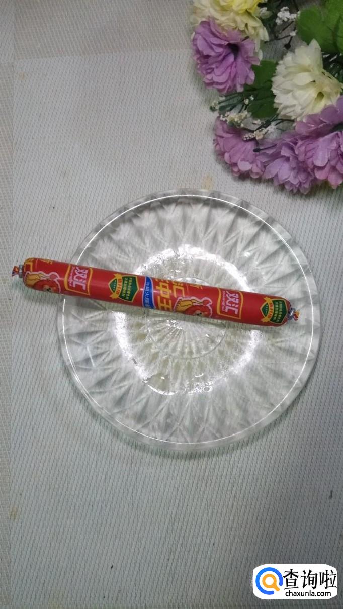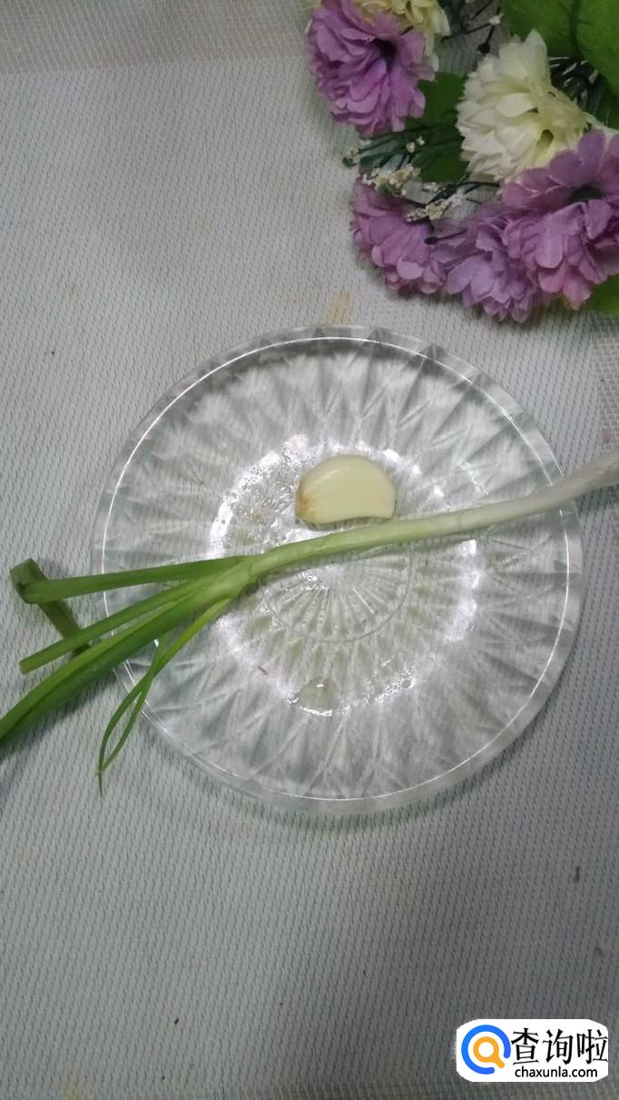准备适量白菜叶,大蒜,小葱,将它们洗净后备用;再准备一根火腿肠备用。