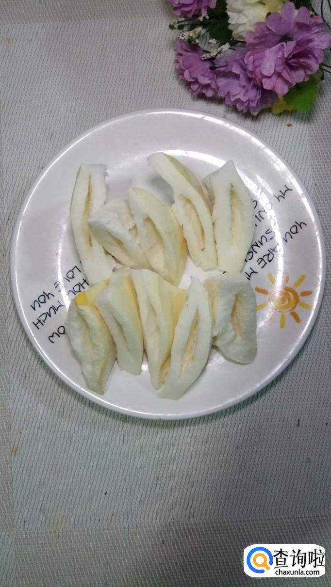 准备一个柚子,用削皮刀去除外皮,果肉吃掉,只剩下中间白色的部分,切成三角块儿,中间做一个小洞,如图所示。