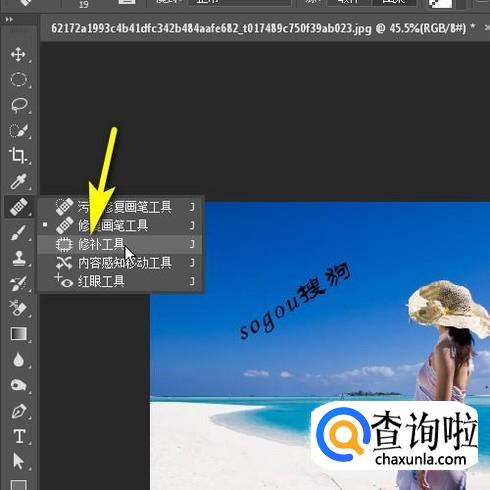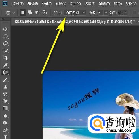 再在上面的属性栏中,设置修补模式为内容识别,如图所示。