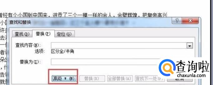 先打开所需要的word文档,再点击菜单栏的“编辑”按钮,再选择其中的“替换”。在弹出的“查找和替换”的对话框中选择“高级按钮”