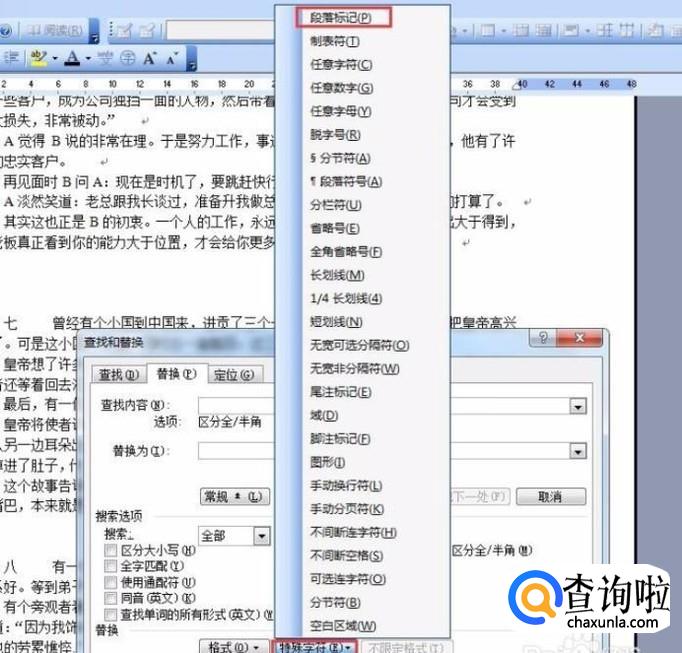 在“高级”选项中,点击“特殊字符”,展开菜单。选择最上面一栏的”段落标记“。这时候,在”查找内容“文本框中的是”^p“(^p代表的是段落标记,也就是落换行)