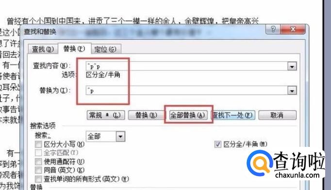 然后将此段落标记替代成“^p^p”并且点击全部替换。