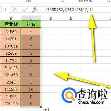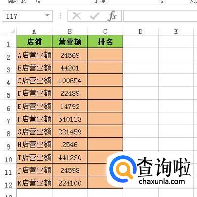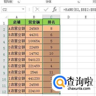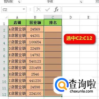 如下图的数据, 接下来,要进行营业额从高到低排列,结果显示在C2:C12单元格中。