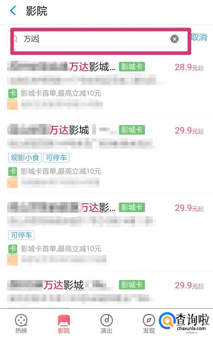 在影院页面上的搜索框中输入万达,会显示你所要观影地区所有的万达影院。然后,点击自己想要去的万达电影院。