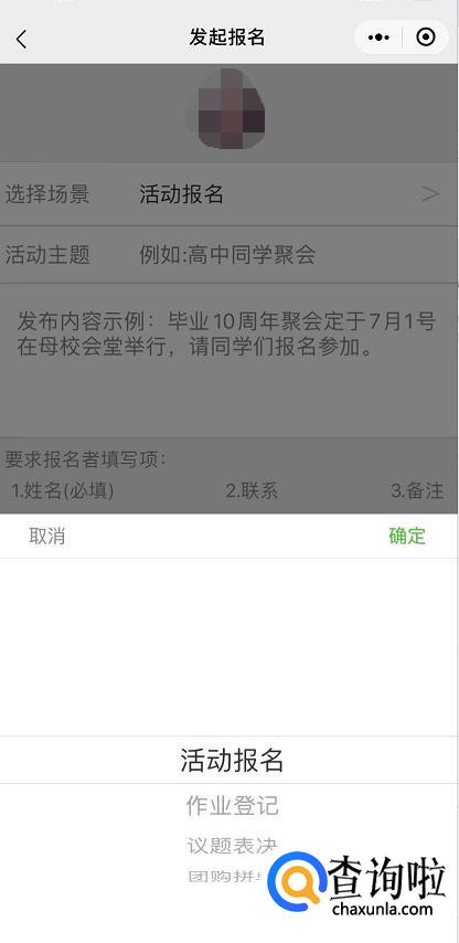 在“选择场景”里有三个场景:活动报名、作业登记、议题表决、团购拼单,下面以“活动报名”为例。