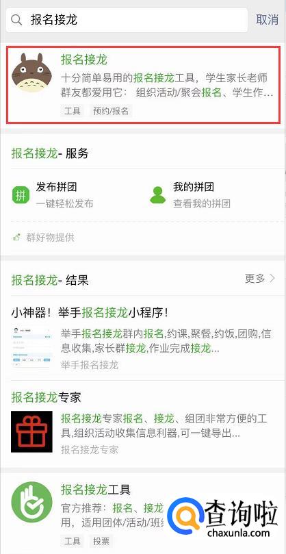 在微信小程序中搜索“报名接龙”,然后点击打开,点击屏幕下方的“我来发起”。