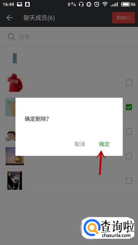 进入删除成员界面,点击想要踢掉的成员,点击“删除”