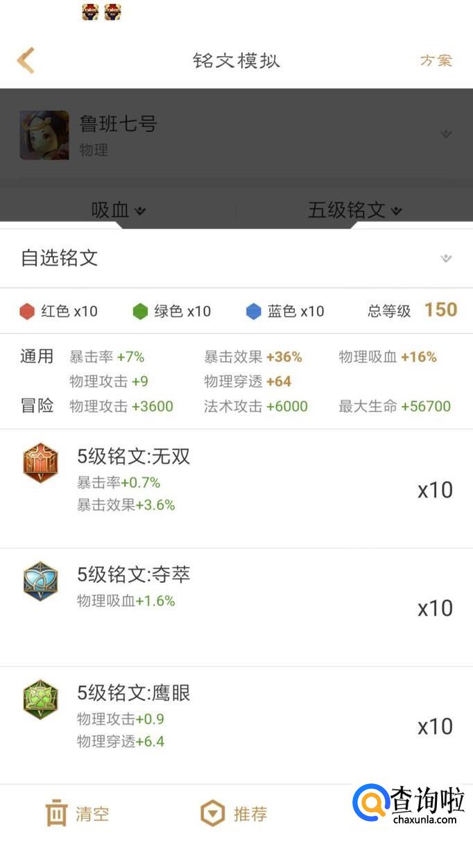 铭文搭配:百穿暴击吸血。红色铭文出无双,提高暴击率,重要的是增加暴击效果,后期暴击的时候是很可怕的;绿色铭文出鹰眼,增加物理伤害和物理穿透;蓝色铭文出夺萃,增加物理吸血,这样就有16%物理吸血,我们就不用出其它的吸血装备了。铭文属性:7%暴击率,36%暴击效果,16%物理吸血,9物理攻击,64物理穿透。