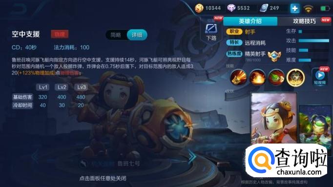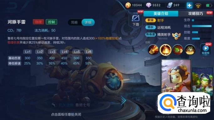 一技能河豚手雷,鲁班七号向前扔出一枚河豚手雷,对一个圆形范围内的敌人造成物理伤害和持续的减速;二技能无敌鲨嘴炮,发射炮弹击飞身边单位并且造成物法伤害,可以用来防止刺客近身,也可以用来抢龙抢人头,比较无敌的一个技能。