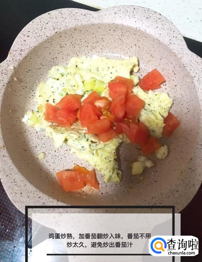 接着锅中放入适量的食用油,待右冒烟,先把鸡蛋炒好,再倒入番茄煸炒出汁水,如下图所示。