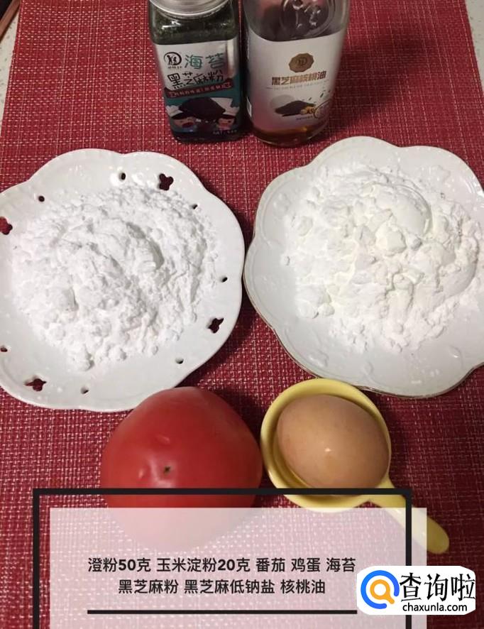 首先准备好所有的食材,如下图所示。小贴士:面粉50克,玉米淀粉20克,番茄一个,鸡蛋一个,核桃油适量。