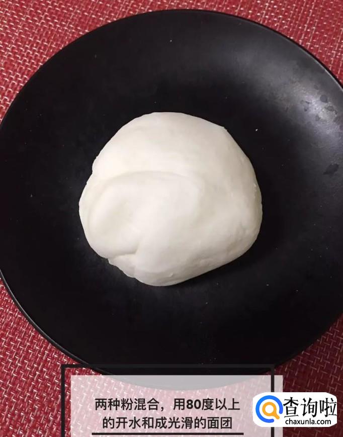 然后将两种面混合在一起,用80°以上的开水和成光滑的面团,如下图所示。