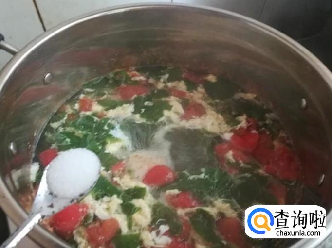 打入前面准备好的鸡蛋,边搅边倒入,这样就会形成蛋花,再加入适量的食盐入味2分钟。