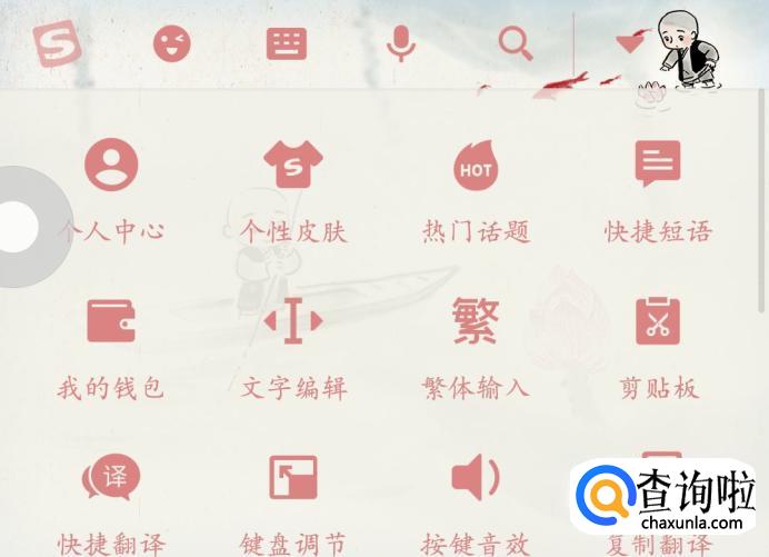 安装好之后,我们打开手机键盘,点击键盘上左上角搜狗输入法的标志,再选择个性皮肤。