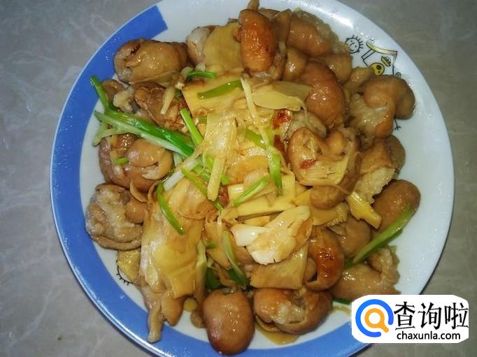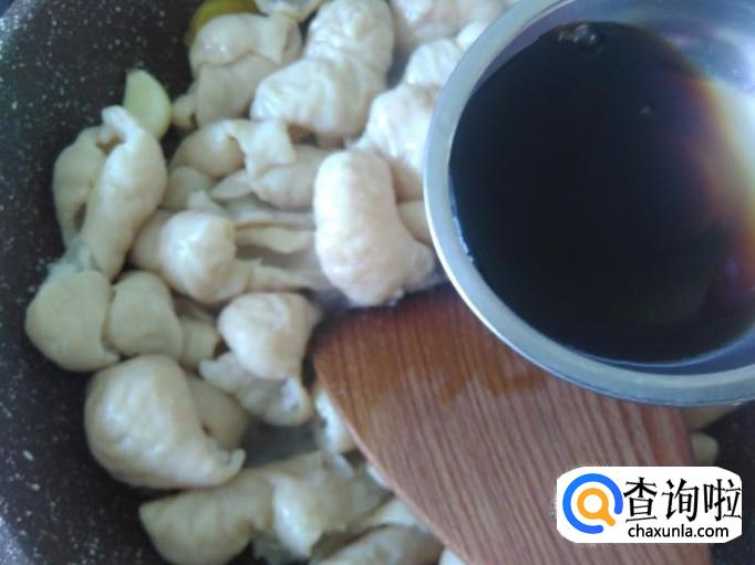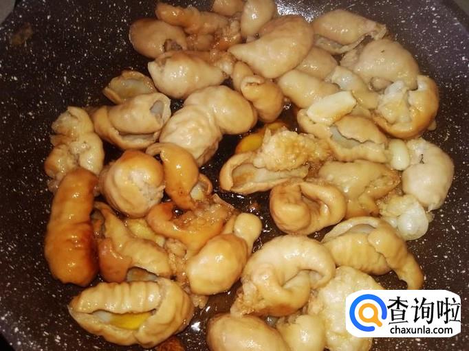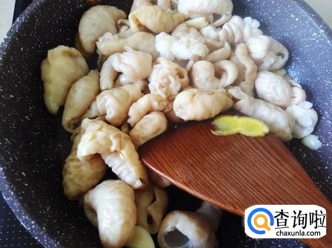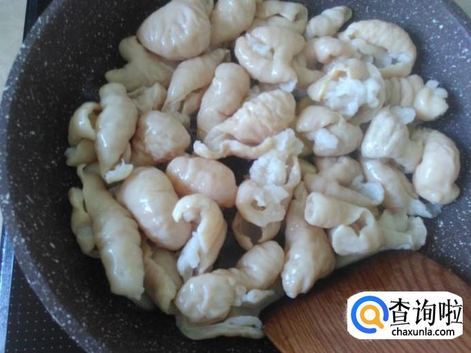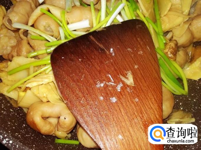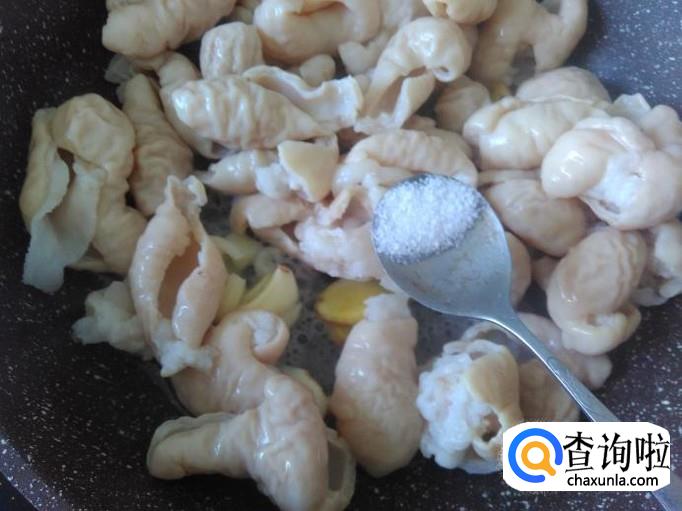 猪肠下锅,加适量的盐翻炒入味。