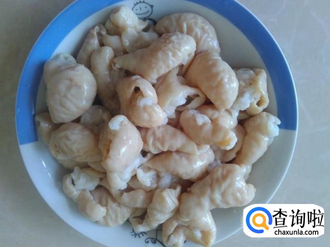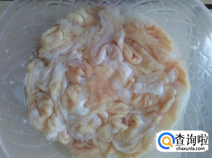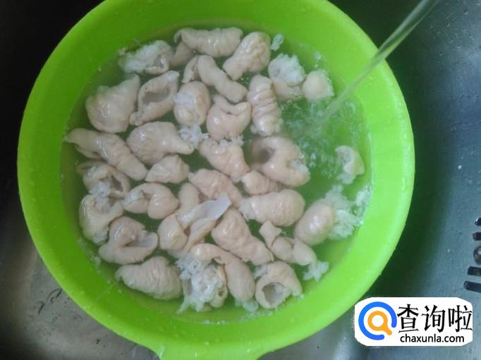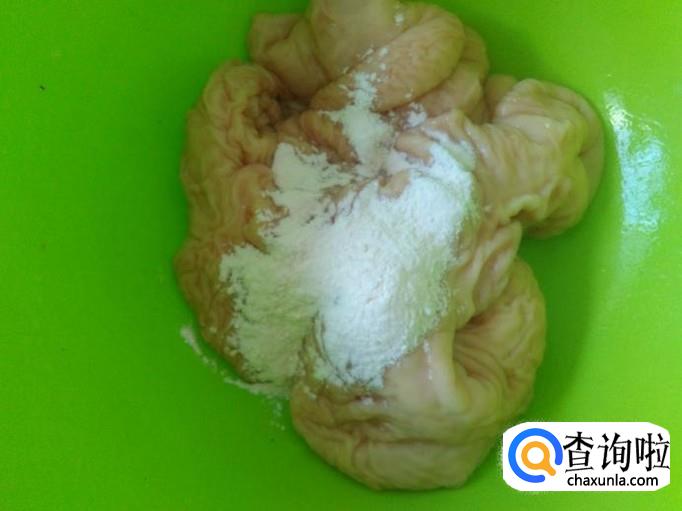大肠加2勺面粉下去用手抓捏5分钟左右,再把大肠里面翻出来抓5分钟左右,然后用清水冲洗几次,捞上来切成一圈圈。