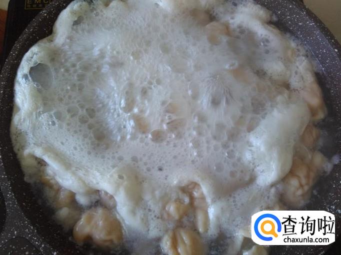 锅里装适量的水煮沸,然后放猪肠进去灼2分钟左右。