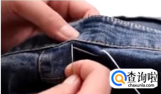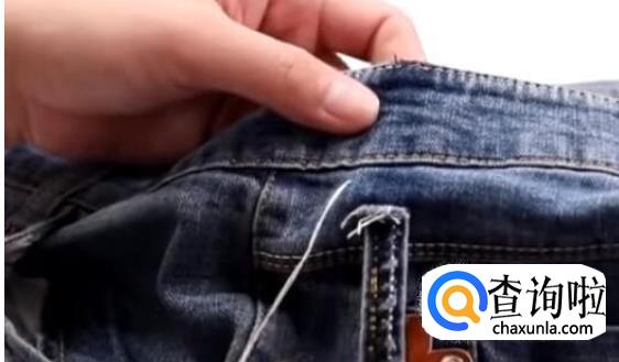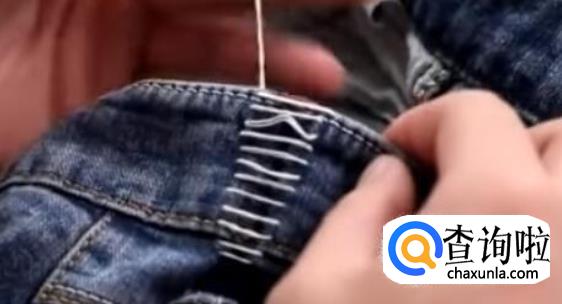 接下里我们把这个小带子给它缝到上面去,这样的话它就隐形了。如果觉得裤腰还是大了,我们可以在另一边对称的地方也是用同样的方法处理一下,这样我们穿起来裤腰就小很多了。