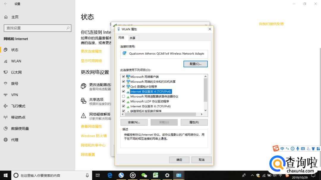 打开WLAN界面,点击“属性”选择“Internet协议版本4(TCP/IPv4)”。