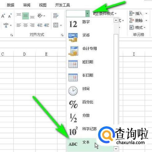 再如图所示,点击这个按钮,弹出的菜单中,再点:文本;即是把A列单元格设置为文本格式。