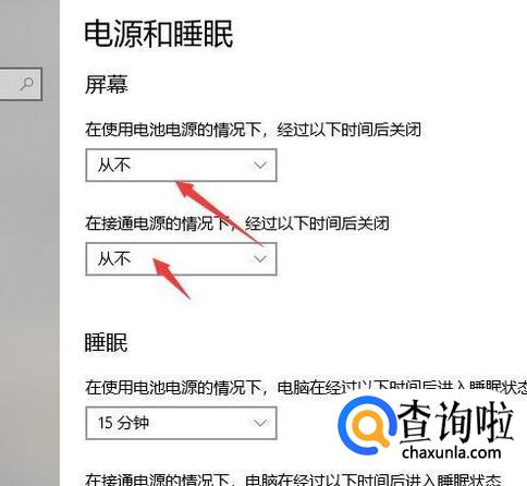 然后点击电源和睡眠,接着将下面的两个选项都设置成从不,这时候就不会使屏幕锁屏了,也能让屏幕一直亮着了。