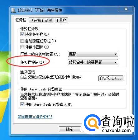 会弹出【任务栏和开始菜单属性】,如下图所示: