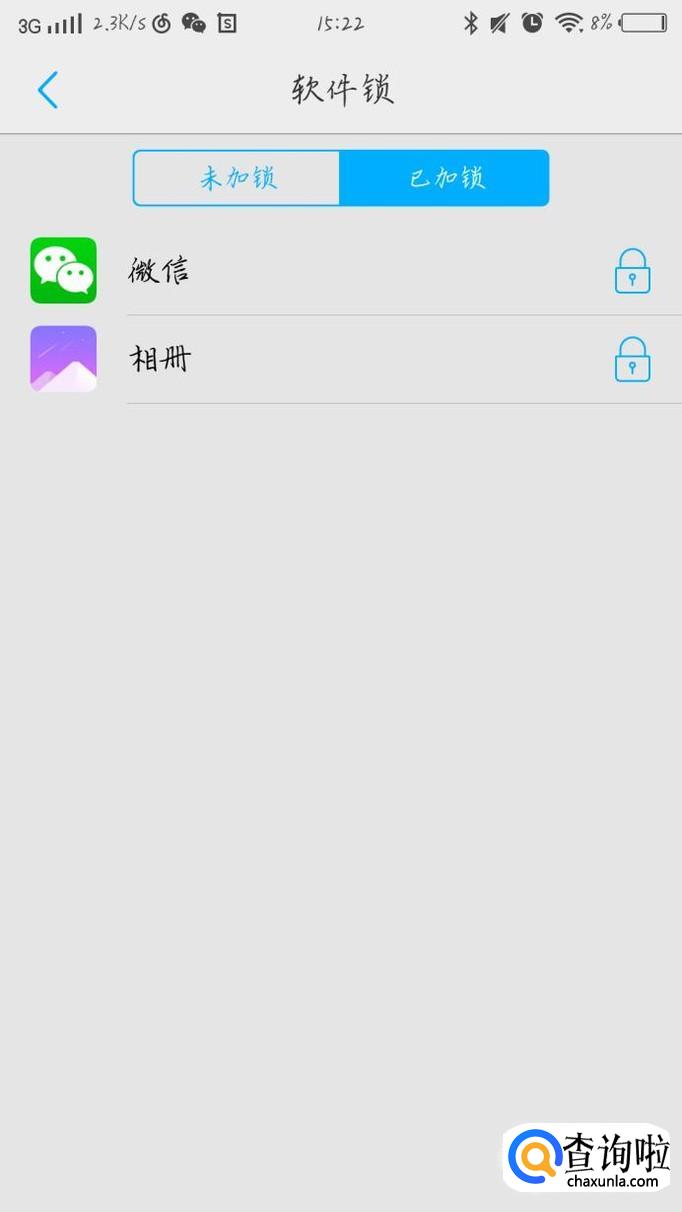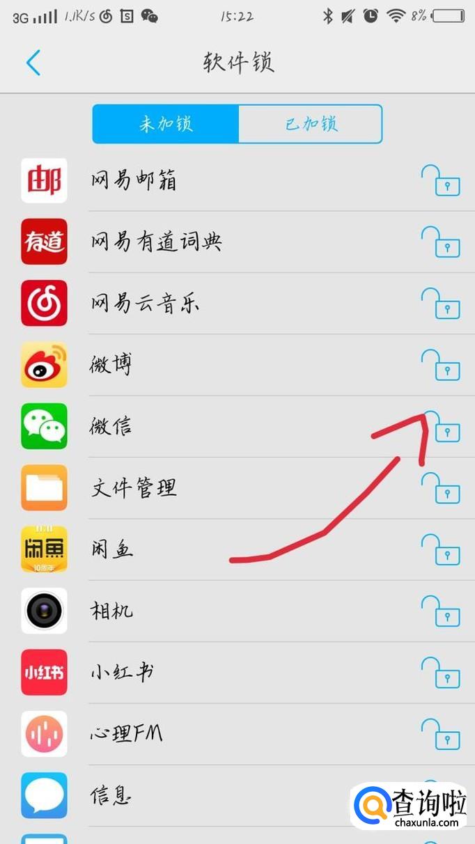 点击“微信”后面的锁,如图1箭头所示。这样你就可以看到你的微信上锁了,之后进入微信就要密码了。
