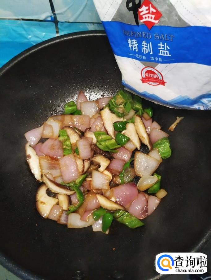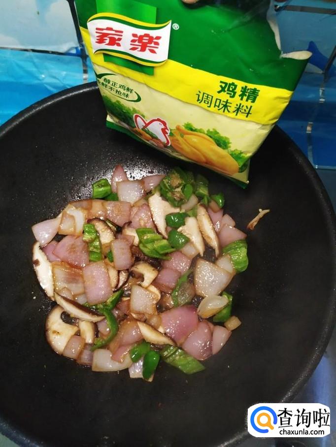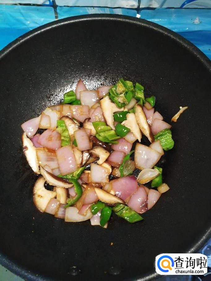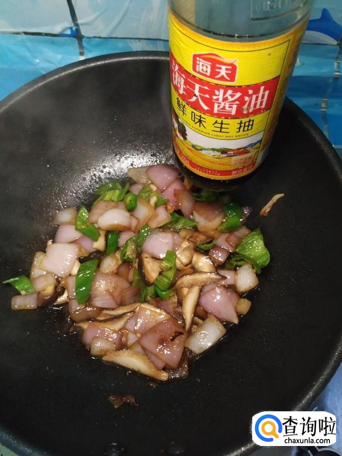 香菇适量,洋葱适量,青椒适量,白砂糖适量,盐适量,鸡精适量,五香粉适量,生抽适量。