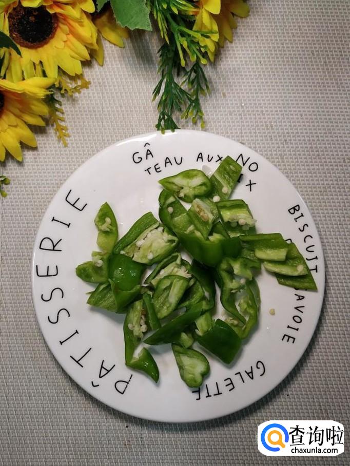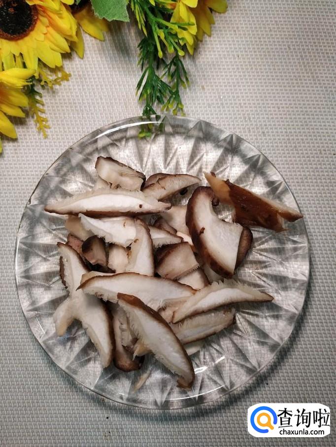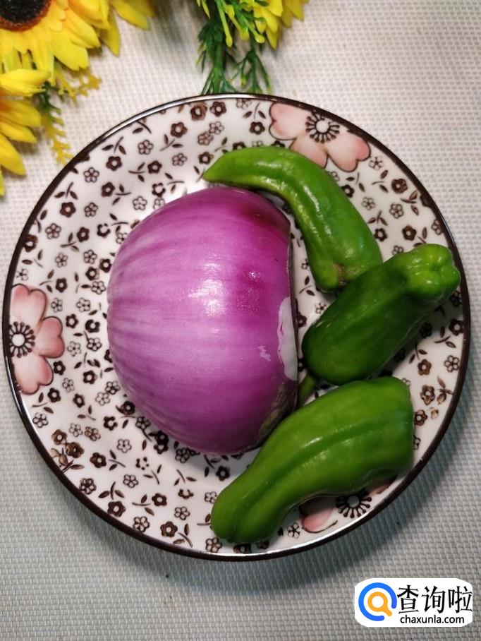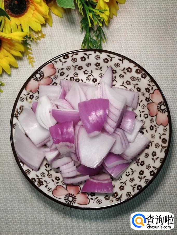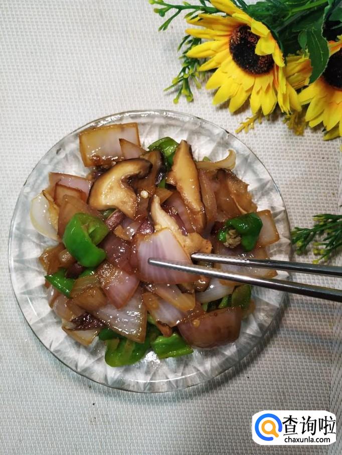 将香菇切成片;将洋葱和青椒,也切成片儿,分别放入盘中备用。