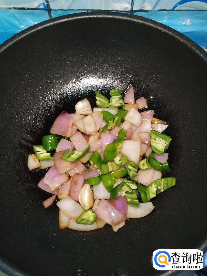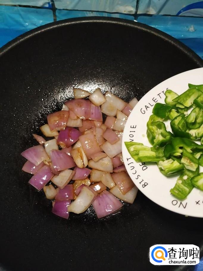 将准备好的青椒片儿倒入锅中,和洋葱一起翻炒均匀。