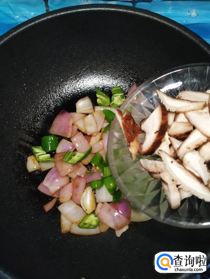 将香菇倒入锅中,翻炒均匀。