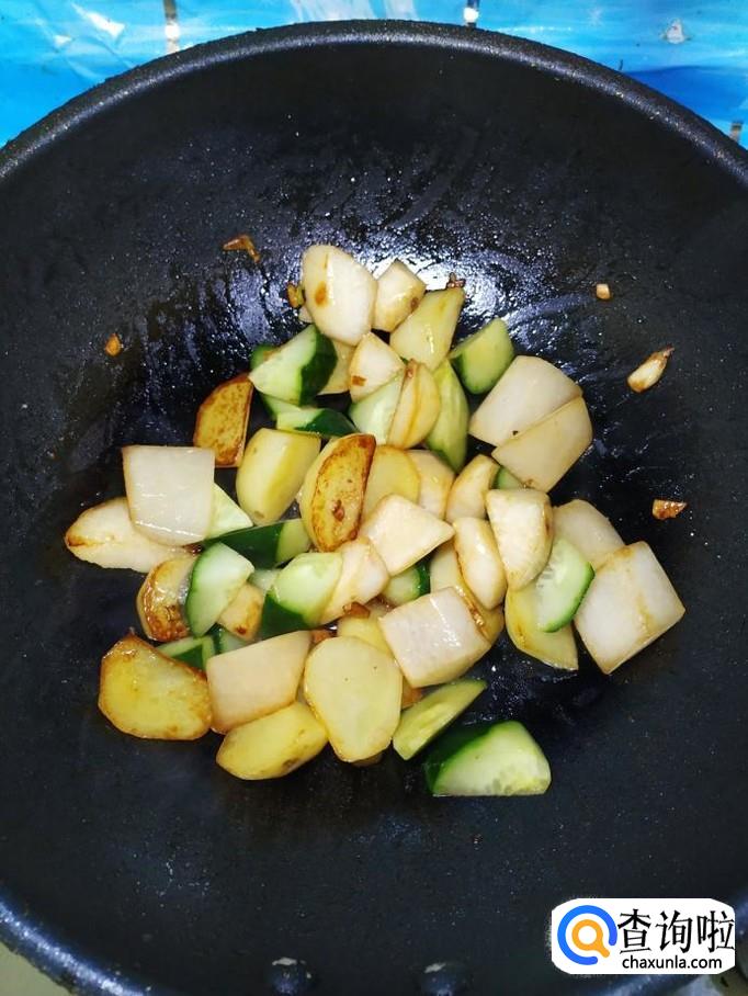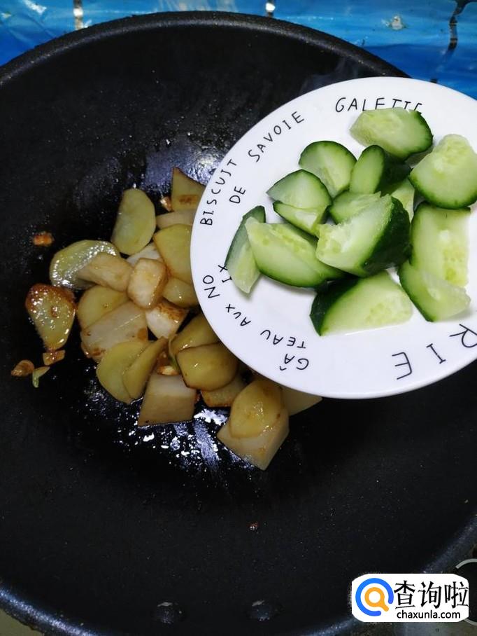 大约炒两三分钟左右,将准备好的黄瓜倒入锅中,翻炒均匀。