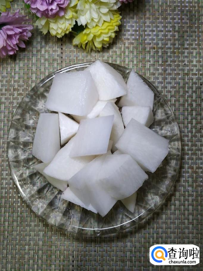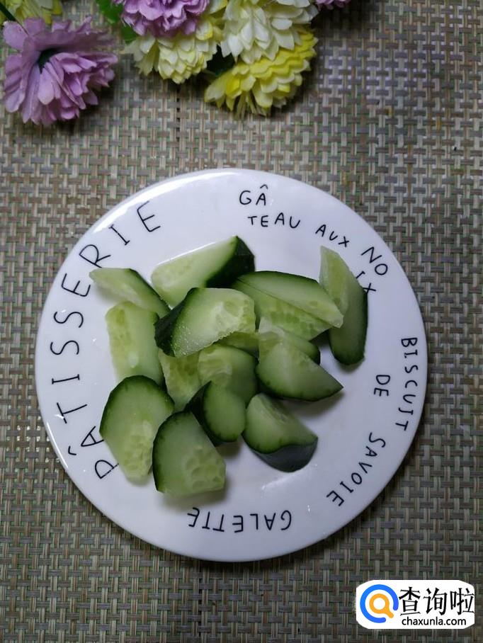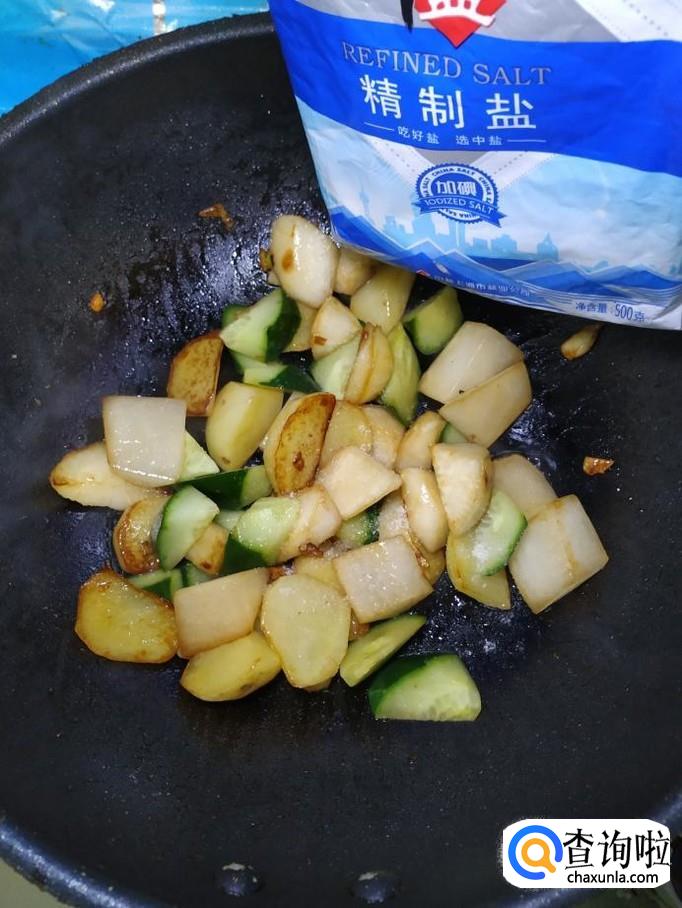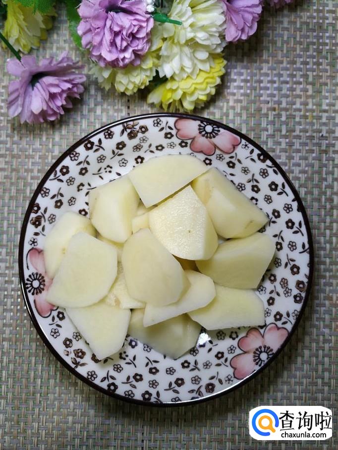 将白萝卜洗净,去皮后,切成滚刀块儿,放入盘中备用;将黄瓜切成滚刀块儿;将土豆去皮,切成滚刀块后,洗去淀粉,放入盘中备用。